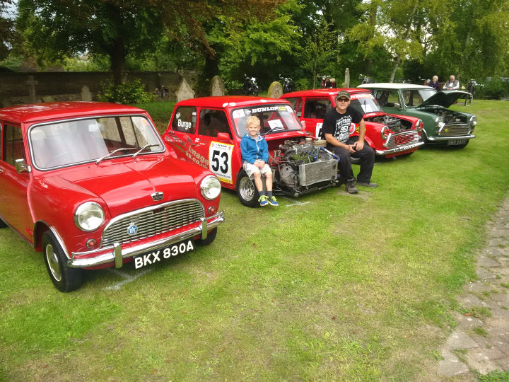 Niven Burge and his grandson Ronnie with Niven's two track racing Minis flanked by a 1965 Austin Mini Delux (red) and a 1967 Mini Cooper (green)